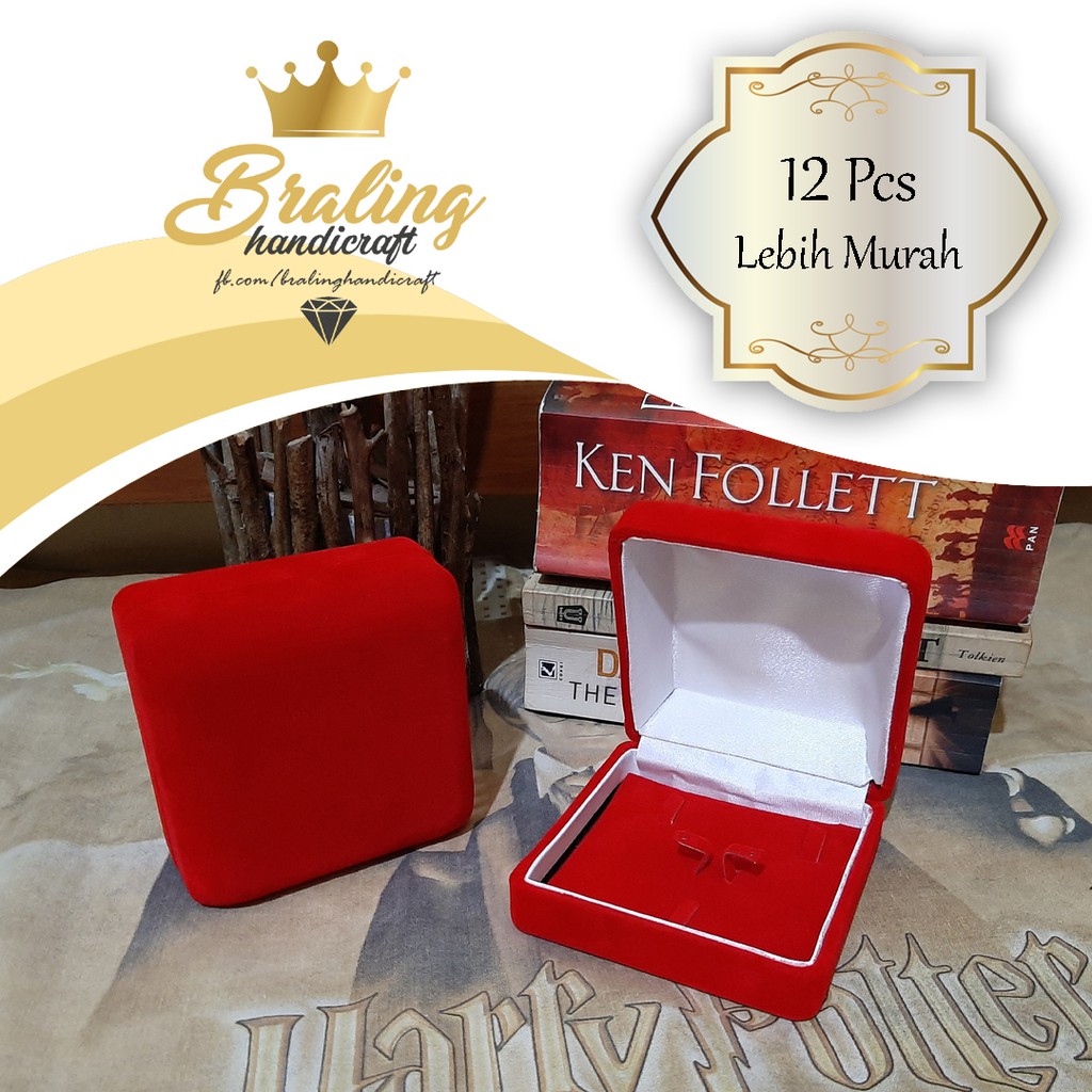 HARGA GROSIR JAUH LEBIH MURAH (Untuk pembelian minimal 12 Pcs).Ukuran :P X L X T = 9.3 x 9.3 x 4.3 CmKotak tempat set perhiasan berbahan bludru, ukuran agak besar.Muat untuk satu cincin, satu kalung dan sepasang anting.Braling HandicraftMenjual Kotak Perhiasan (Cincin, Gelang, Anting, Kalung, Liontin, Jam Tangan) Pajangan Perhiasan (Display Perhiasan) dllTokoDs. Sidanegara RT 02 RW 02Kaligondang, Kab. Purbalingga, Jawa Tengah