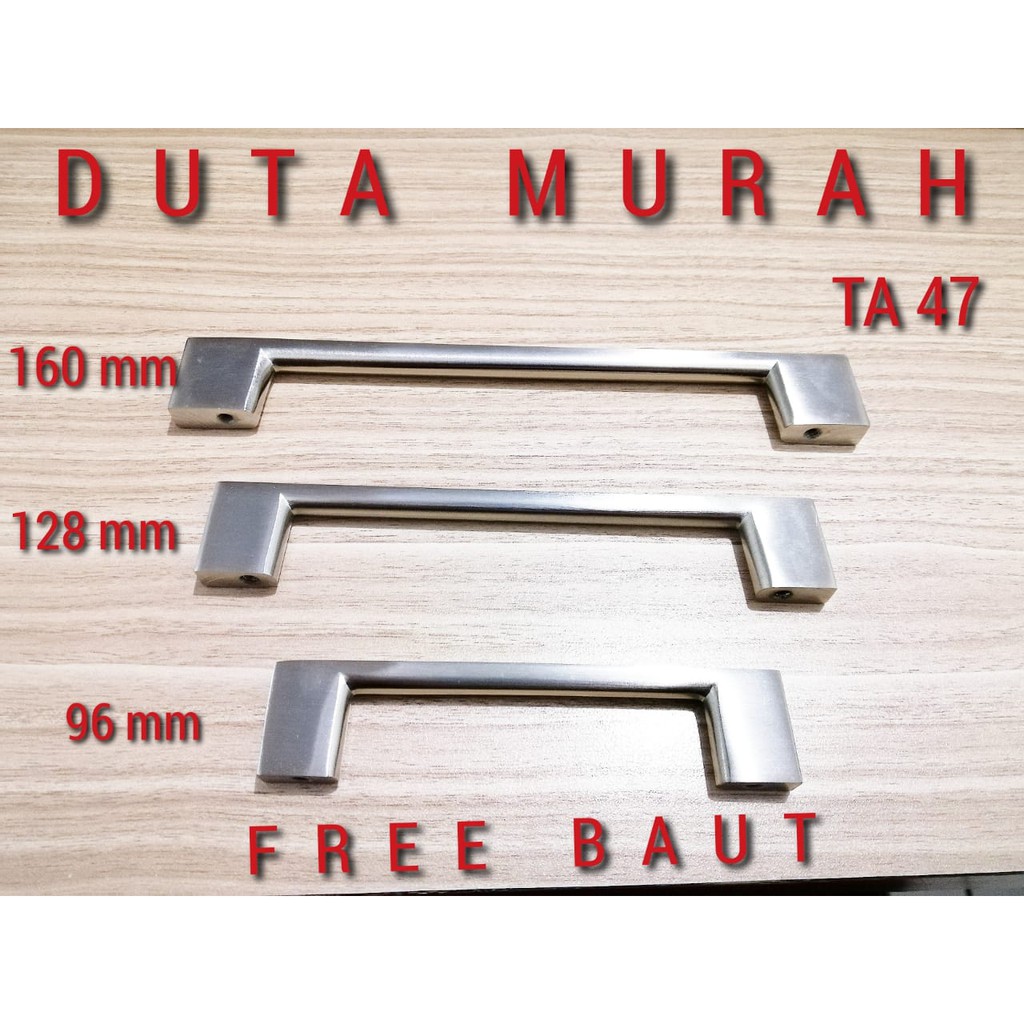 BACA DESKRIPSI!!!!Produk sebelum dikirim telah kami cek/packing aman ( KERUSAKAN DISEBABKAN OLEH EKSPEDISI BUKAN KESALAHAN DARI TOKO...)* Segala kerusakan pada pengiriman tidak ditanggung oleh Seller.* Membeli=Setuju.* Barang tidak ada garansi.* Tidak Menerima Sisipan Warna dan Variasi diCATATAN / VIA CHAT.* Cek dahulu sebelum Checkout kami tidak terima Ganti Nama, Nomor, Alamat, atau Barang setelah Checkout.* Silakan pilih variasi yang mau dibeli/cadangan, jika tidak ada dikirim secara random oleh admin.* Mohon Melakukan Video Unboxing Saat Terima Paket* Jika ada kekurangan barang harap fotokan label pengiriman dan melampirkan video Unboxing Tanda video Unboxing komplain tidak kami terima.Handel Tarikan LaciWarna : Brush NikelType : TA 47 128 mmBahan Kaki Handel : Crhome AnodizeBahan Handel : AluminiumUkuran : Panjang : 15.1 cm Panjang Skrup ke skrup : 128 mm Lebar : 0.7 cm Tinggi : 2.5 cmType : TA 47 160 mmBahan Kaki Handel : AnodizeBahan Handel : AluminiumUkuran : Panjang : 18.9 cm Panjang Skrup ke skrup : 160 mm Lebar : 0.9 cm Tinggi : 2.5 cmType : TA 47 96 cmBahan Kaki Handel : Crhome AnodizeBahan Handel : AluminiumUkuran : Panjang : 11.3 cm Panjang Skrup ke skrup : 96 mm Lebar : 0.7 cm Tinggi : 2.5 cmHarga : Per PcsFree SkrupBarang yang masih bisa di pesan berarti ready ya kak..CATATAN :Open : Senin - Sabtu (08.00 - 16.00) Kecuali Hari libur Atau Tanggal Merah Nasional LIBURPengiriman maksimal H + 2 (rata-rata pengiriman H+1, untuk pengiriman dihari yang sama invoice masuk sebelum jam 16.00 untuk Reguler dan Grab/Gojek Sameday jam 15.00 ). Jika lebih dari H + 1 akan kami konfirmasi.Kami melayani sesuai antrian dan berusaha memberi pelayanan sebaik-baiknya. Terima Kasih dan Happy ShoppingJangan Lupa Kasih Bintang ⭐⭐⭐⭐⭐mohon untuk komplain sertakan bukti vidio unboxing,kami tidak bisa proses untuk komplain tanpa barang bukti trima