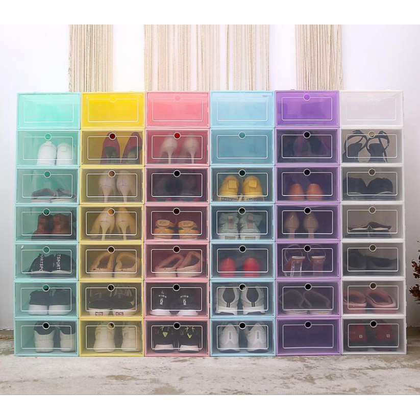 Kotak sepatu model flip lipatBahan plastik kokohAda pengait antar boxBisa disusun sampai 15 tumpuk keatasModel buka tutup (lebih awet daripada model tarik).putih size 32 x 21.5 x 12.5 cmhijau tosca size 32 x 21.5 x 12.5 cmbiru muda size 32 x 21.5 x 12.5 cmmerah muda size 32 x 21.5 x 12.5 cmungu size 32 x 21.5 x 12.5 cmPutih L size L 33 x 23.5 x 13.5 cmHarga per boxFungsi kotak sepatu transparan sbb:- Merapikan lemari sepatu Anda.- memudahkan memilih sepatu yang ingin Anda pakai.- Dapat dilipat kembali jika tidak terpakai, sehingga menghemat tempat.- Menghindari sepatu dari debu dan kotoran, serta lubang ventilasi agar sepatu tidak lembab.Spesifikasi produk:Bahan : Plastik Solid PolypropyleneModel : Flip Buka ke Depan.Frame depan berwarna sesuai dengan warna box nya (lubang bulat).Dapat ditumpuk, ada pengait di atas frame, samping kiri dan kanan frame, serta di belakang kotak agar kotak tidak bergeser saat ditumpuk.* Mohon untuk langsung memilih VARIAN sesuai WARNA yg diinginkan atau bisa menulis diketerangan,apabila tidak ad keterangan maka kita akan mengirimkan WARNA RANDOM.* Khusus untuk SIZE L, mohon untuk langsung memilih VARIAN L. Kami tetap akan mengirim SIZESTANDAR meskipun ada keterangan untuk SIZE L jika varian yg dipilih tetap SIZE STA