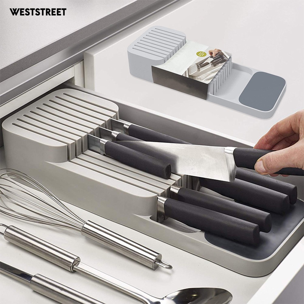 Specifications:It is durable and easy to clean.Large capacity, can store several knives at the same time.Cutlery holder, convenient and safe for you keep knives. Type: Knife HolderMaterial: PlasticFeatures: Reusable, Easy to Clean, Kitchen Organizer, Kitchen ToolSize: 39.7cm x 14.3cm x 7.3cm/15.6" x 5.63" x 2.87" (Approx.) Notes:Due to the light and screen setting difference, the items color may be slightly different from the pictures.Please allow slight dimension difference due to different manual measurement. Package Includes:1 x Knife Holder (Knife Not Included)#Box #Drawerorganizer #KitchenDining #Separatestoragebox #Silverware #Drawer #Knifestoragebox #Storageboxtray #StorageBox #