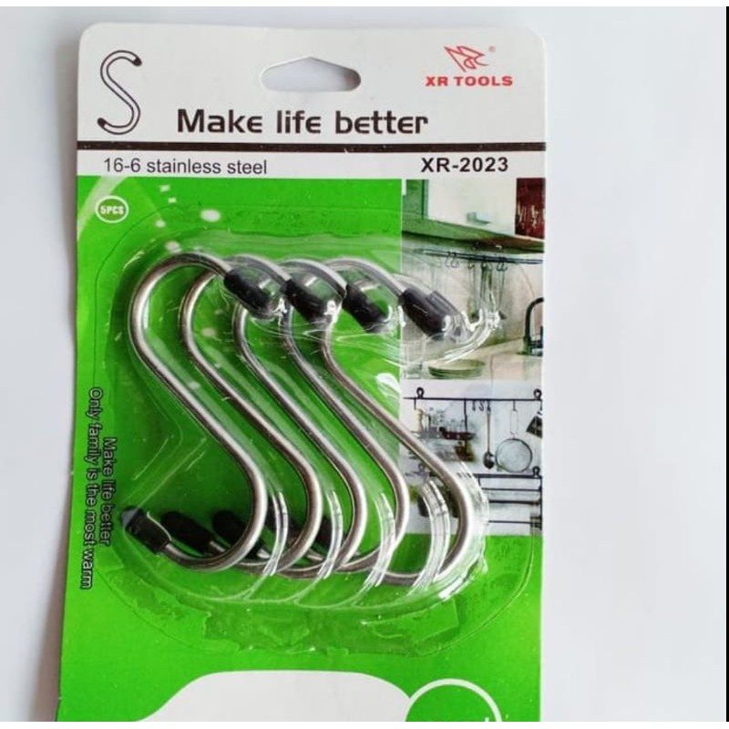 XR-2023Gantungan barang berbentuk huruf S dengan ujung karet yang gampang dicantolkan di mana-mana, dan bisa dipergunakan untuk menggantung berbagai jenis barang. Terbuat dari bahan stainless steel, gantungan ini tahan lama dan tahan karat.Size : 7 cmukuran S Material : Stainless SteelNOTE : Harga yang tertera adalah harga untuk 1 pack = 5 pcs