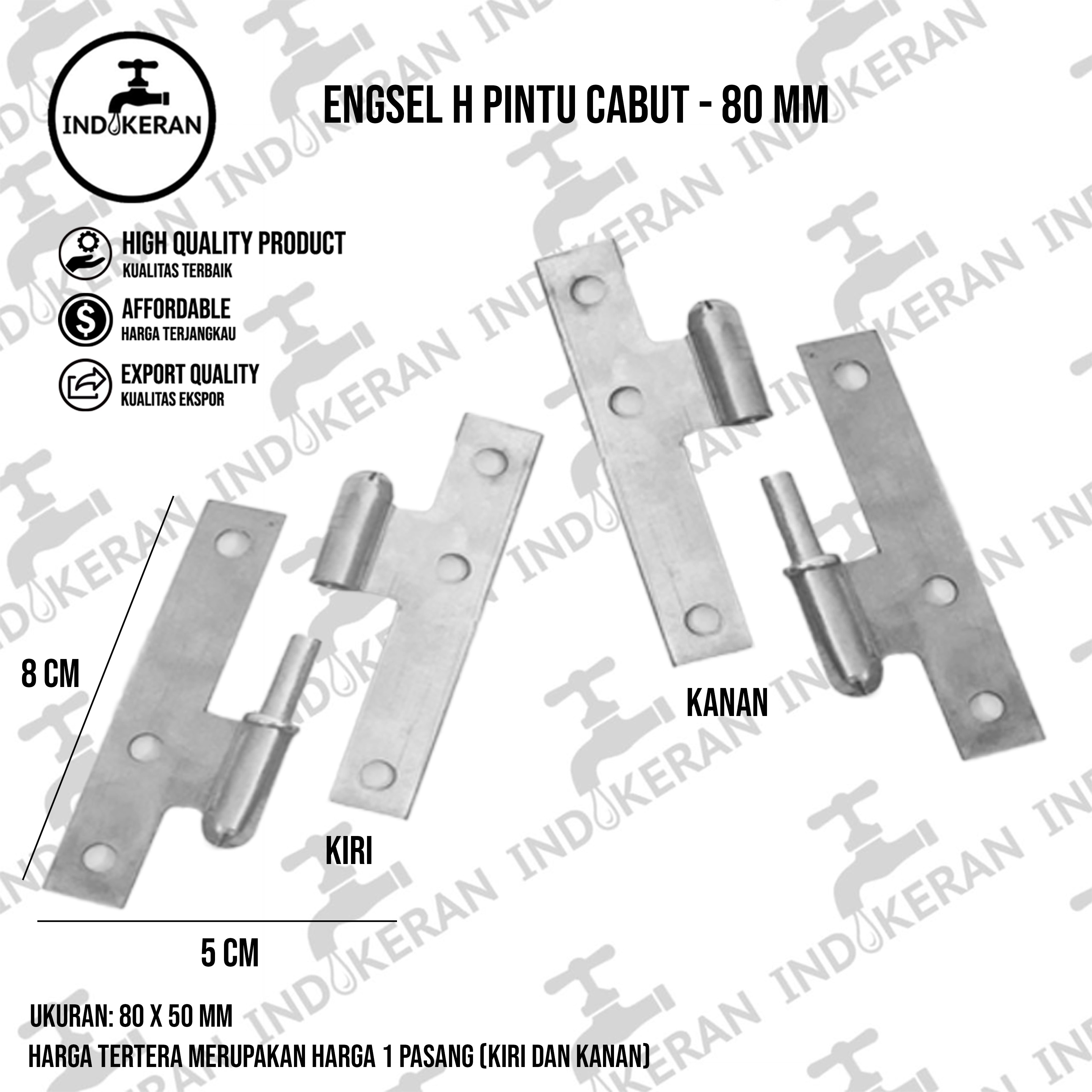 INDOKERAN - Engsel H Pintu Cabut - 80Fungsi :Engsel pintu yang berbentuk huruf H ini menjadi elemen pada pintu yang berbobotringan (misalnya pintu aluminium atau pintu PVC) agar mudah dilepas dan ataudipindahkan. Oleh karena itu, engsel ini juga disebut dengan engsel cabut.Kelebihan :- Praktis,- Efisien,- Kuat dan Tahan Lama,- Awet,- Mudah digunakan,- Mudah dipa