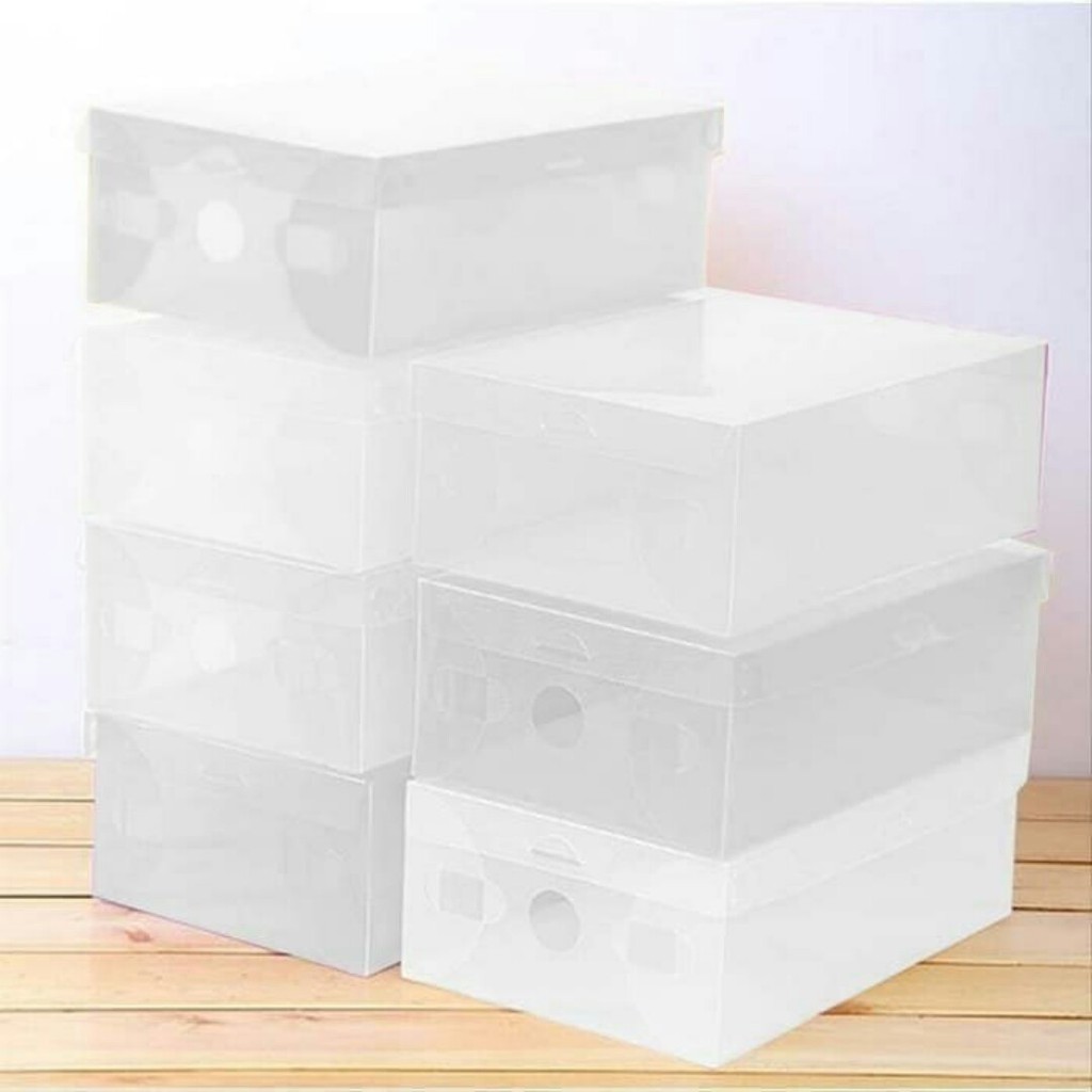 Box Sepatu (ketebalan 0.6 mm)Bahan: Solid PPModel: Regular dengan bukaan atasUkuran: 28 x 18 x 10 cmTebal: 0.6 mmBox sepatu plastik tebal bisa di tumpuk sampai 4 atau 5 kotak. Bagus untuk membuat rumah lebih rapih dan bersih. Fungsi kotak sepatu transparant sbb - merapihkan lemari sepatu anda- dapat dilipat kembali jika tidak di pakai, sehingga menghemat tempat- menghindari sepatu dari debu dan kotoranwarna yang ready :-